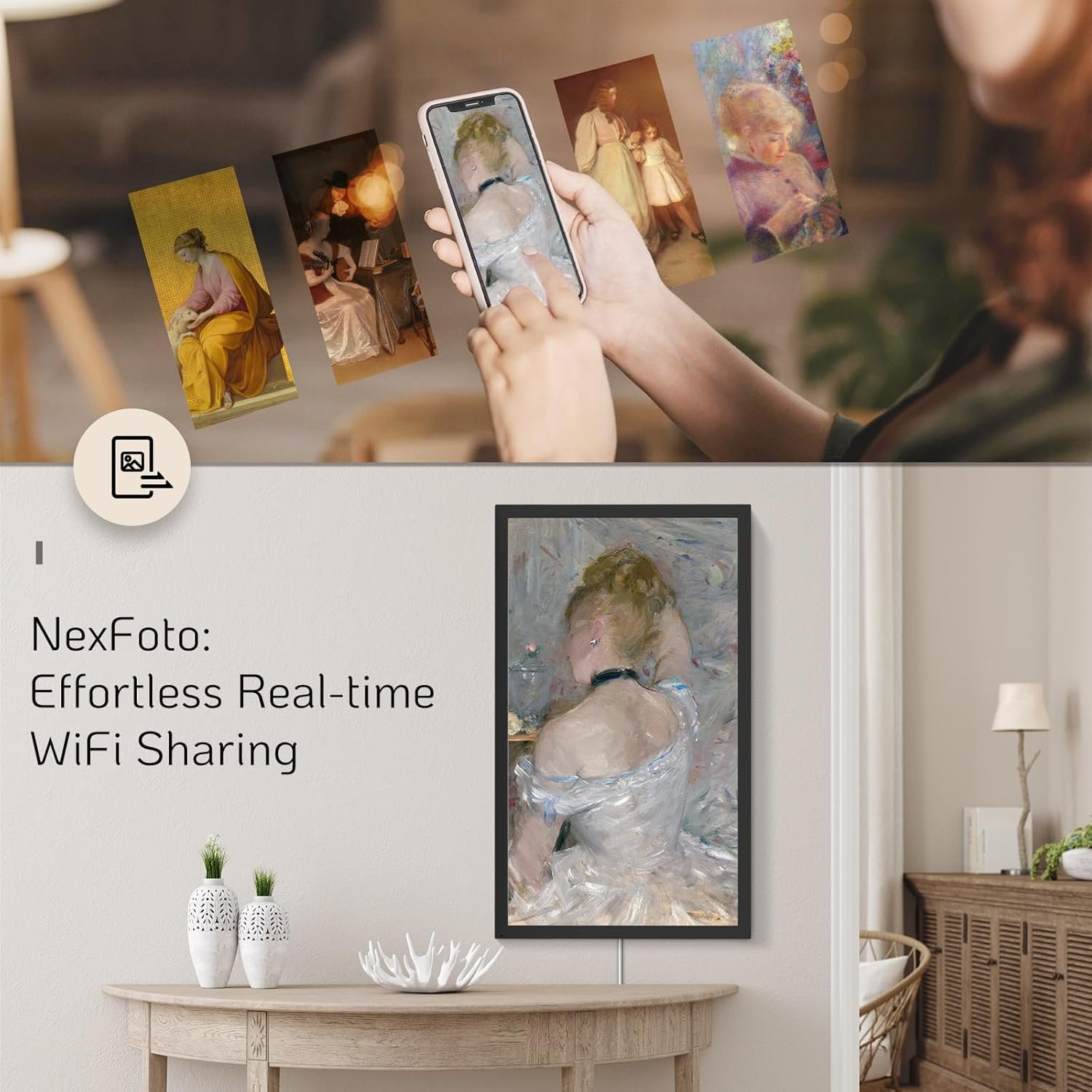 Showcase Your Personal Gallery: NexFoto’s Wifi-enabled electronic picture frame (compatible with 2.4GHz and 5Ghz) brings your art collection and photo album to life on your wall. You can easily explore a diverse range of visual art, including masterpieces and NFT art, while sharing life moments with loved ones from anywhere. The minimalist modern design enhances your home decor, and its wall-mounted design, featuring a swivel mount for easy rotation, provides a gallery-like viewing experience.
