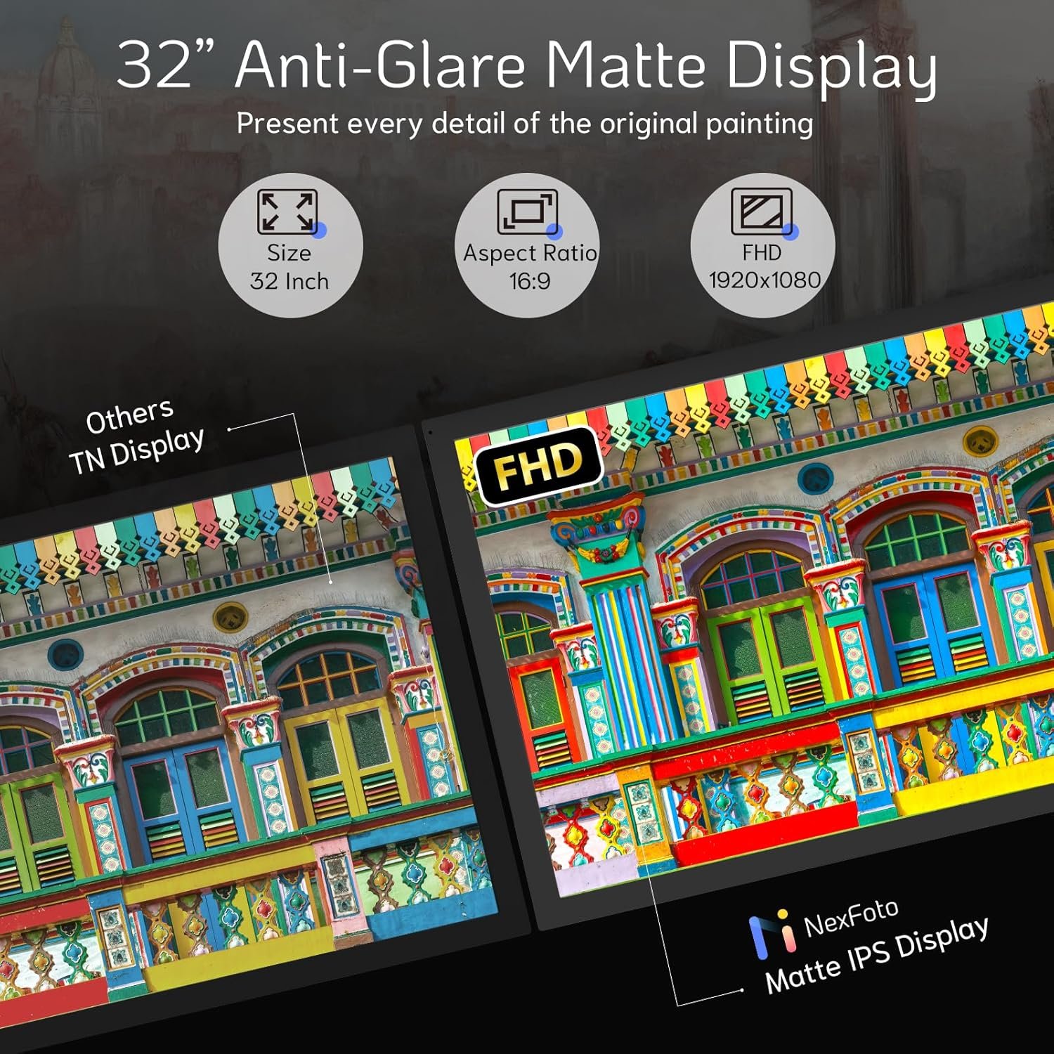 Elite Pro FHD Display with 64 GB Memory & 64GB USB Drive: The NexFoto 32-inch digital art frame features 1920 x 1080 FHD Matte Screen (aspect ratio 16:9) that showcases your memories in vibrant colors and sharp details, while the IPS display technology brings much wider viewing angles. The user-friendly interface and remote control make navigation simple. With 64 GB internal memory, this digital picture frame can store up to 16,000 pictures. Besides, the package comes with a 64GB USB dirve. And if needed, you also can use a micro SD card to expand the storage space.