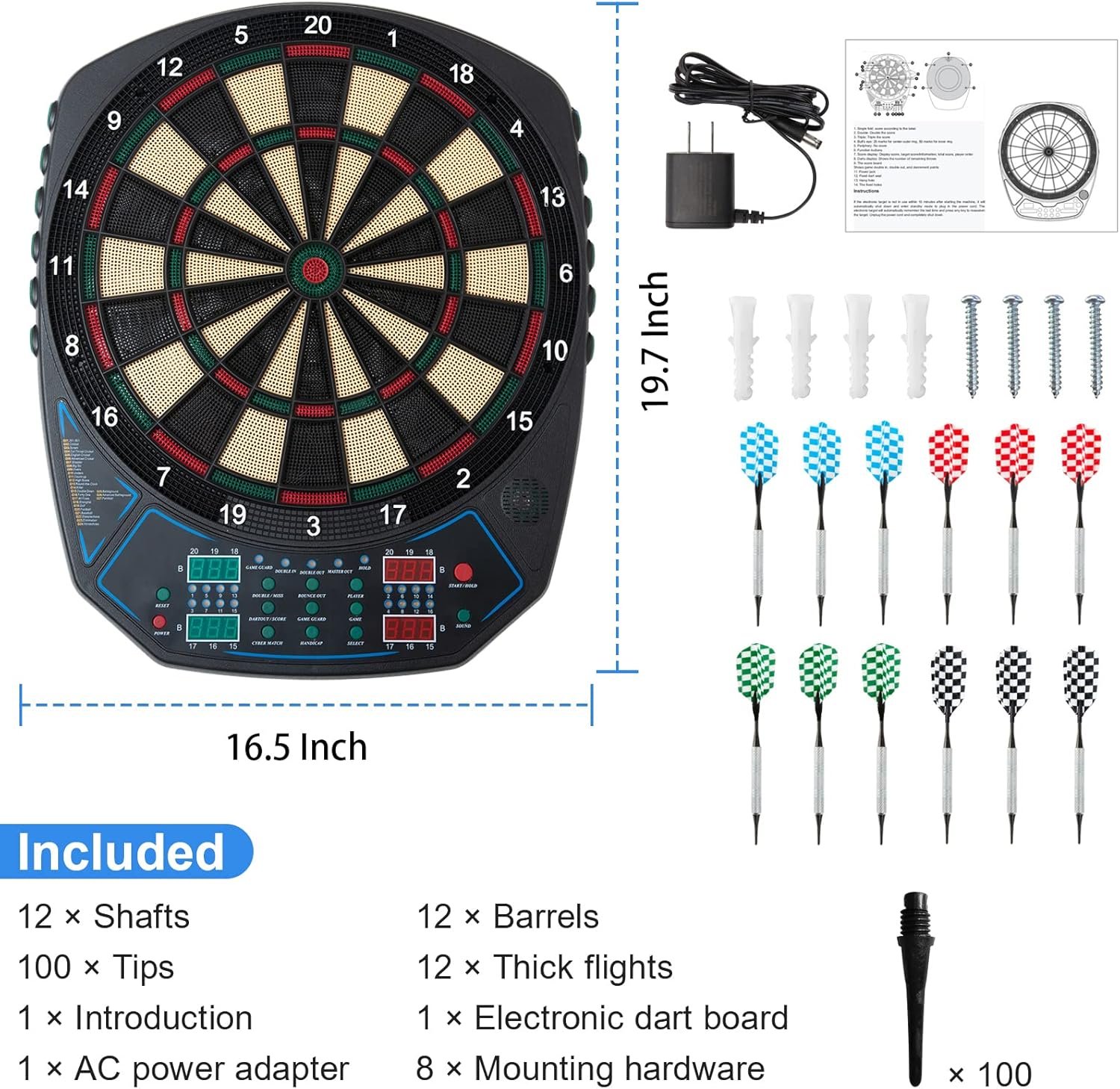 🎁Accessories Included & After-Sale Service – OLI electronic dartboard set includes: Aluminum shafts*12, Spare tips*100, Polypro Flight*12, Power Adapter*1, Operating and Game Instructions*1, Mounting Hardware*8, Product Size: 19.7*16.5*1 Inch; Weight: 3.8 lb. If there are any problem, please feel to contact OLI’s service team directly for any questions.