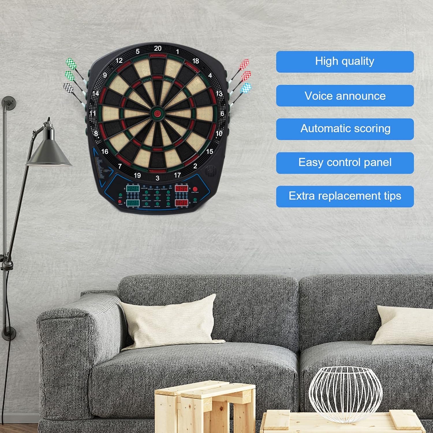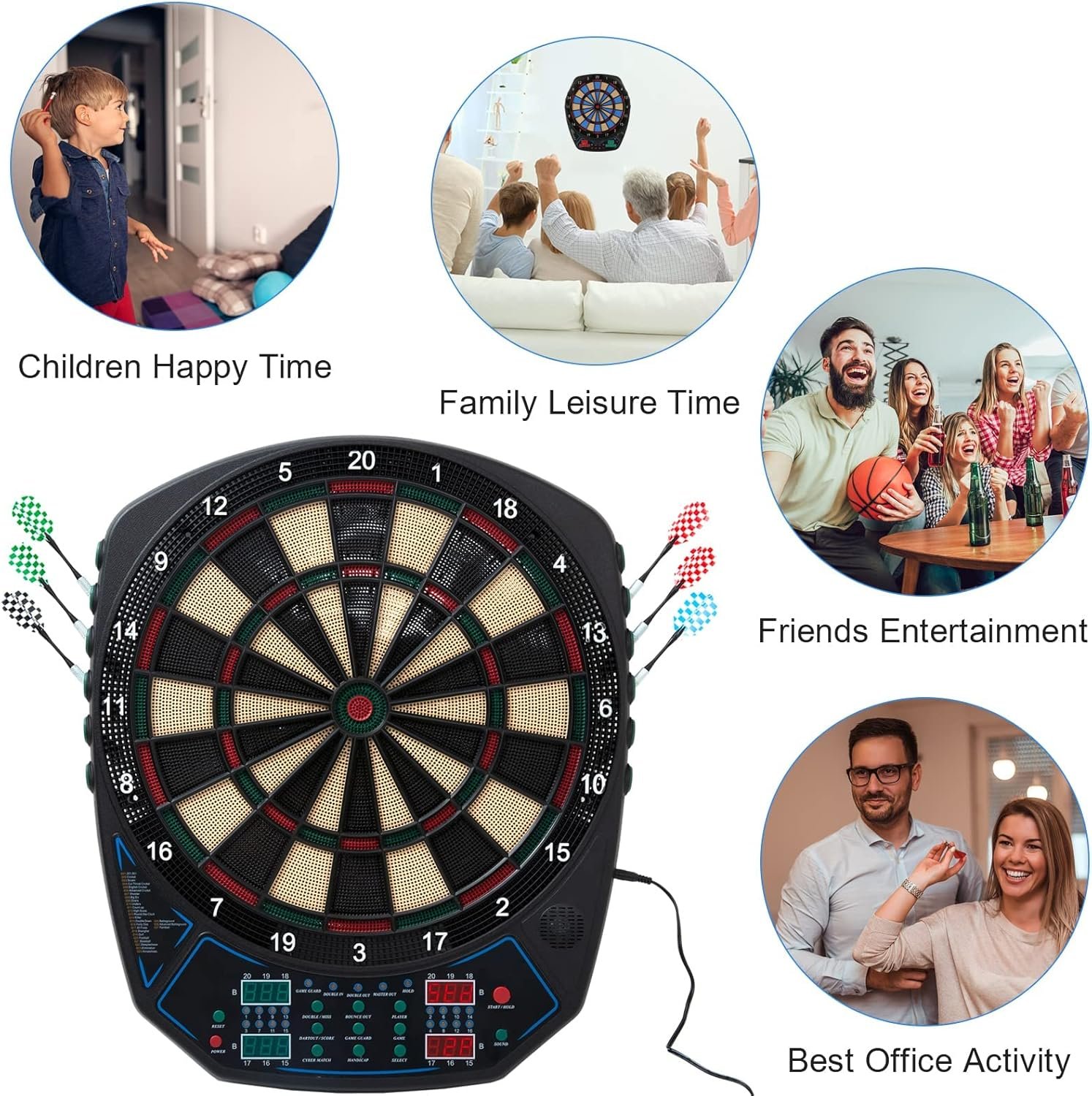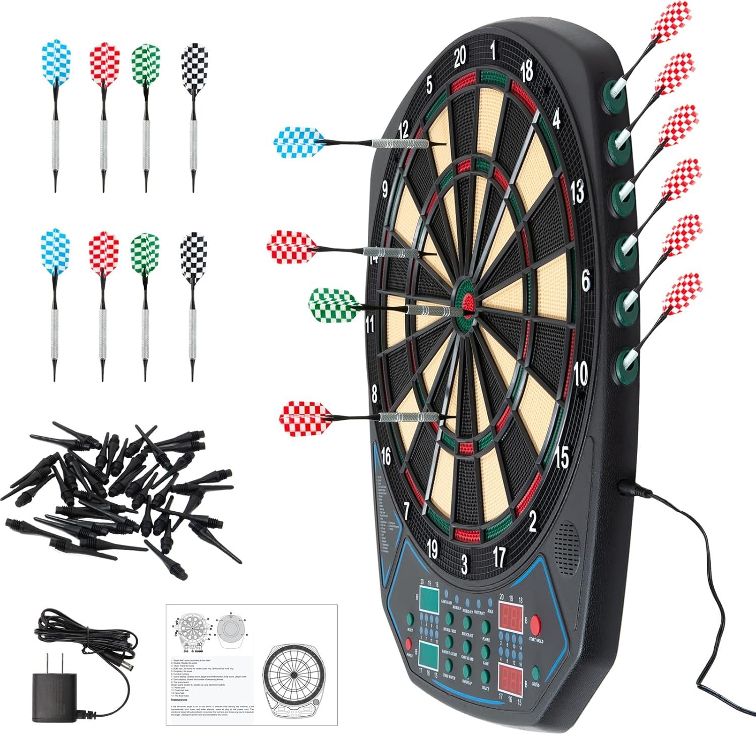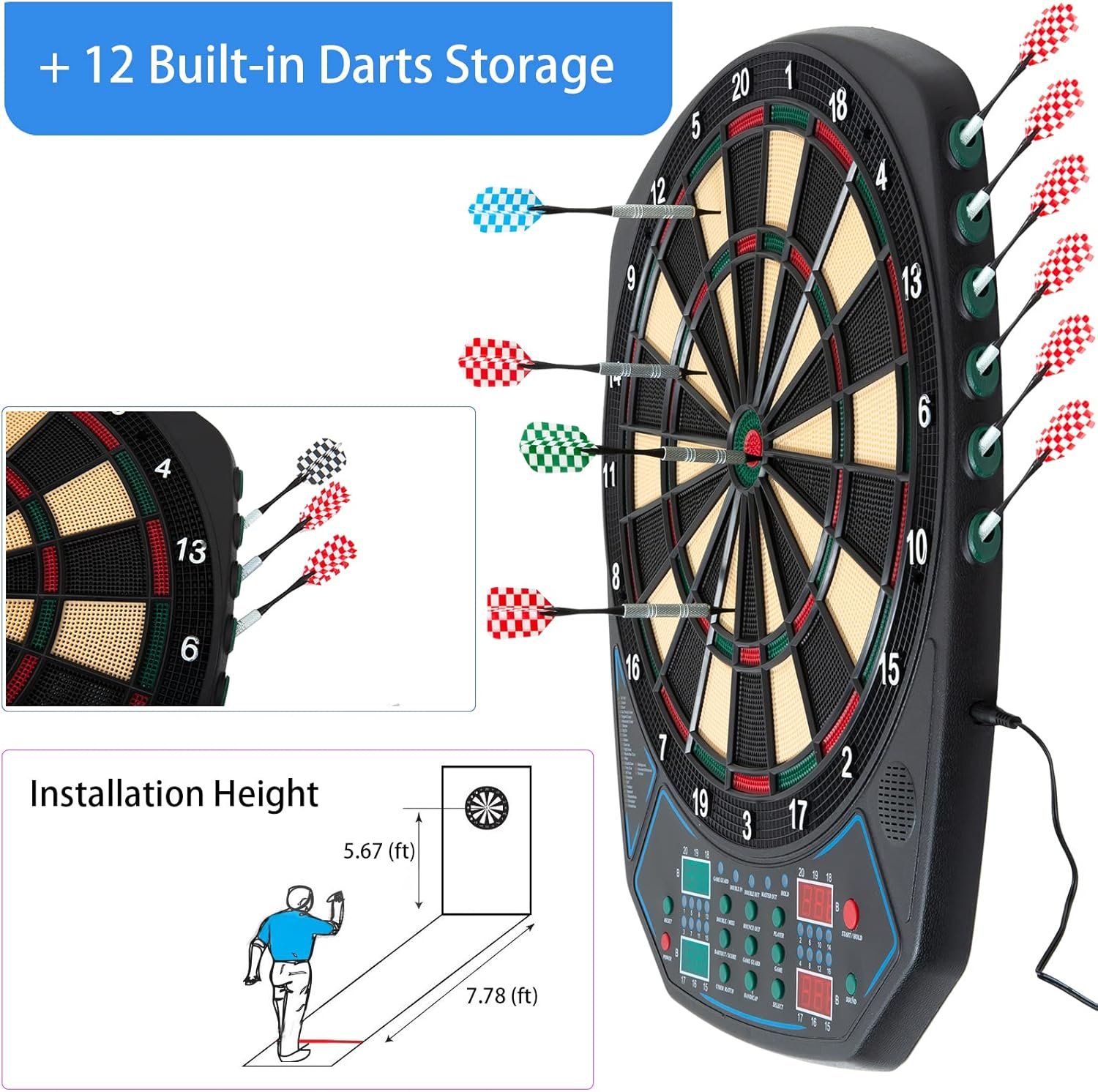🎁Safe & Energy-saving & Eco-friendly Design – 15.8 Inch Wide catch ring and plastic soft tip darts offers protection for your wall from errant throws, the power adapter provides DC 9V 500mA working voltage, so it is also suitable for kids 8-12. LED display and battery-free working are more energy-saving and eco-friendly.